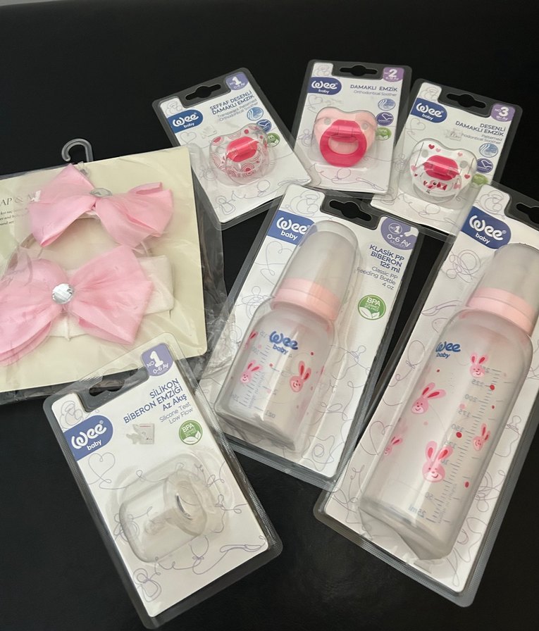 Pastel pembe renkli, desenli plastik bebek emzikleri ve biberonları ile birlikte kurdele aksesuarı içeren set.