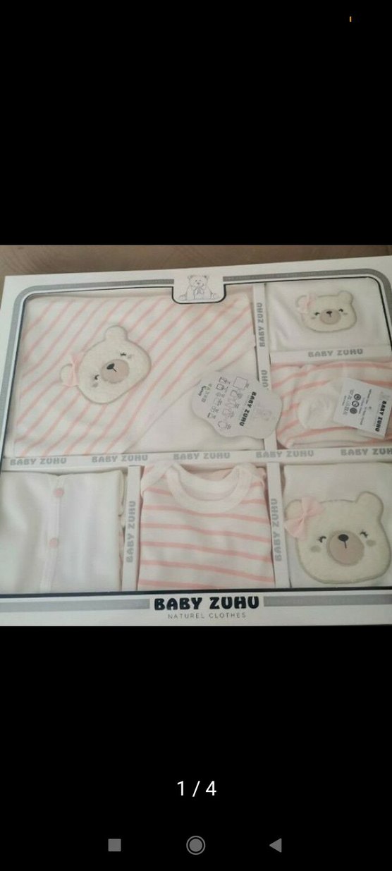 Yumuşak pembe renkte, ayıcık desenli bebek hastane kıyafeti seti. Body, şapka, eldiven ve battaniye içerir. Yeni doğanlar için uygundur.