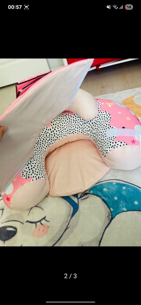 Pastel pembe renkli, desenli emzirme ve bebek oturma minderiyumuşak kumaşlı ve konforlu.