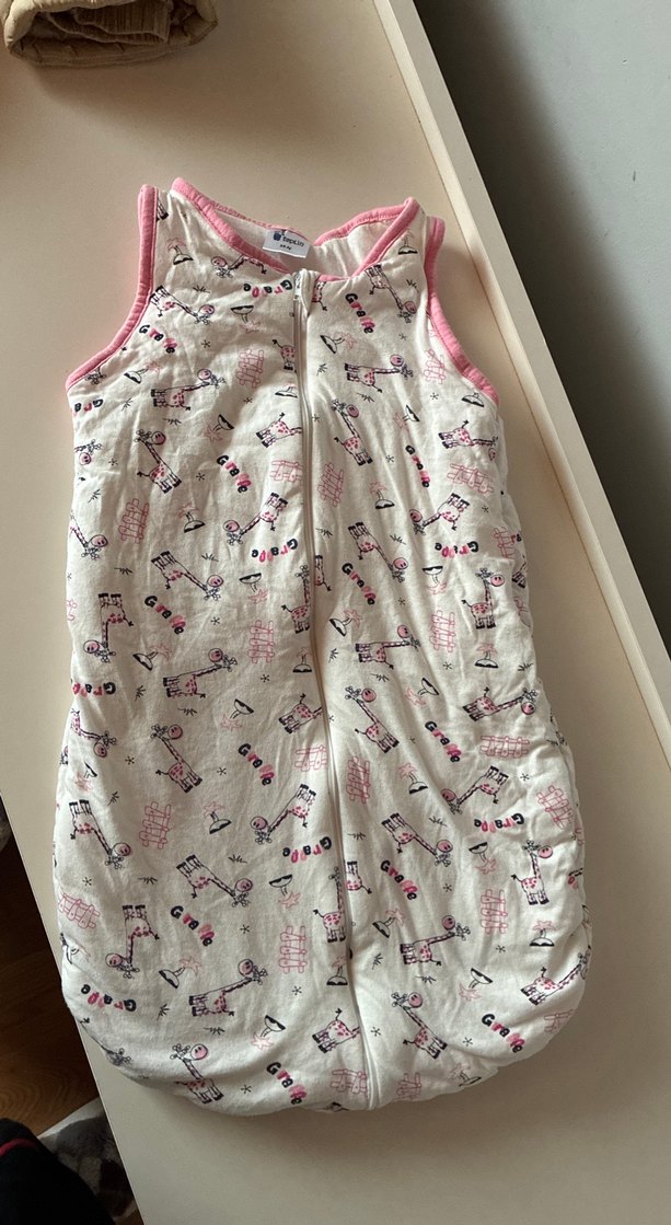 Yumuşak sentetik kumaştan yapılmış, pembe detaylı ve zürafa desenli bebek uyku tulumu. Önde kolay kullanım için fermuar bulunur.