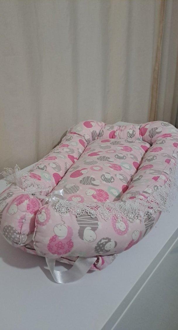Pembe pastel renkli sentetik kumaştan, desenli ve dantelli detaylara sahip bebek uyku yatağı, rahat ve yumuşak bir alan sunar.
