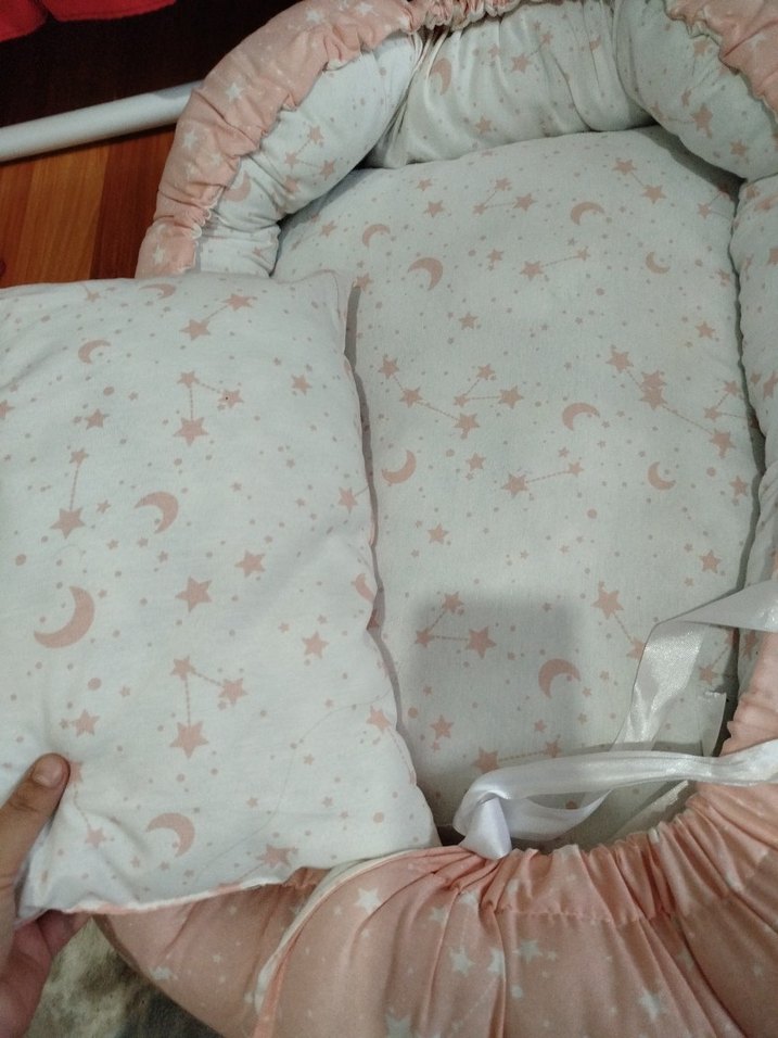 Yumuşak sentetik kumaştan, pembe pastel tonlarda yıldız ve ay desenli bebek yatağı ve uyku yastığı seti.