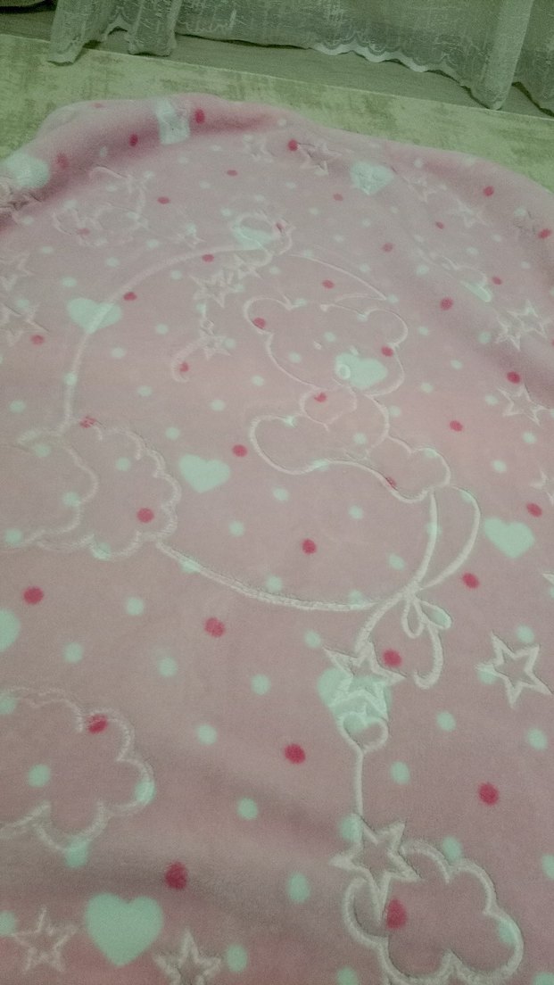 Yumuşak ve sıcak pembe çocuk battaniyesi, kalp, yıldız ve bulut desenleriyle pastel tonlarda. Özdilek marka yeni gibi