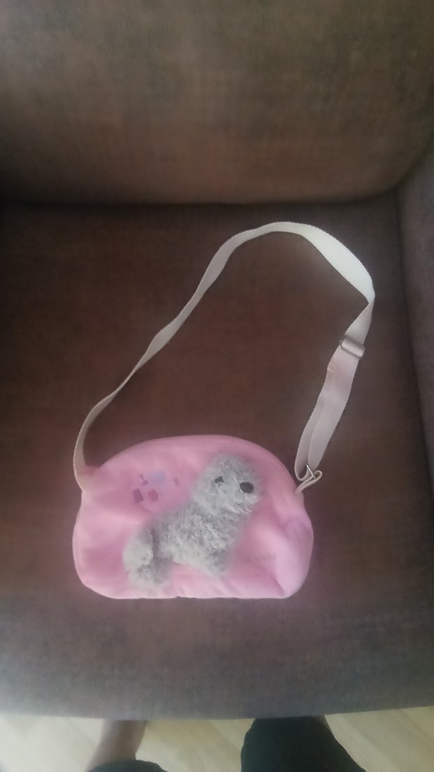 Pastel pembe renkte, yumuşak ve rahat dokulu, desenli, tokalı ayarlanabilir askılı omuz çantası. iç astarında lekelenmeler var