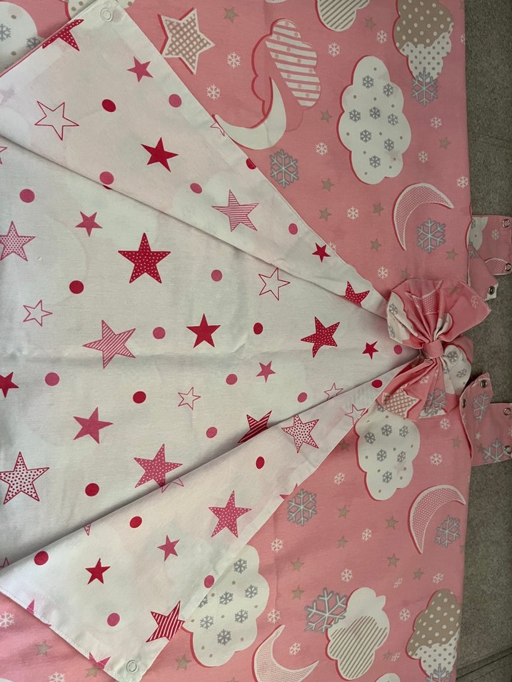 Pembe tonlarında, yıldız, bulut ve ay desenleriyle süslenmiş sentetik kumaştan çocuk uyku örtüsü. Ayarlanabilir bağlama detayı içerir. ⭐puset örtüsü