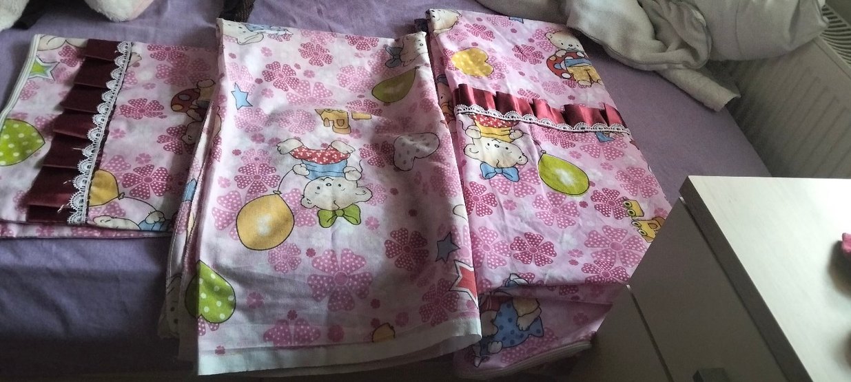 Pastel pembe renkli, sevimli desenlere sahip çocuk uyku tekstili, yumuşak sentetik kumaştan üretilmiştir.