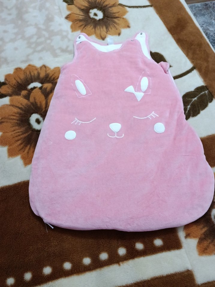 Pastel pembe renkte, desenli, yumuşak ve sıcak kumaştan yapılmış çocuk uyku tulumu. Sevimli hayvan yüzü detaylıdır.