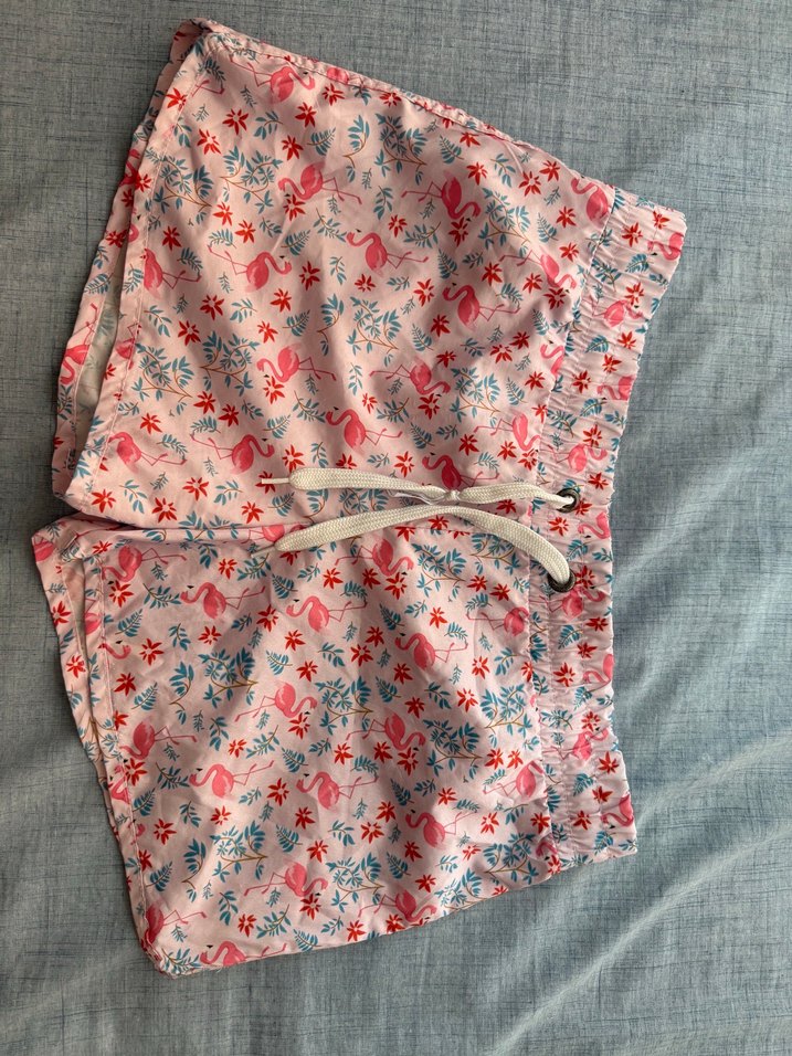 Pastel pembe, çiçek ve flamingo desenli, deniz havuz şortu. Belinde bağcık detayı bulunur bir kere kullanıldı