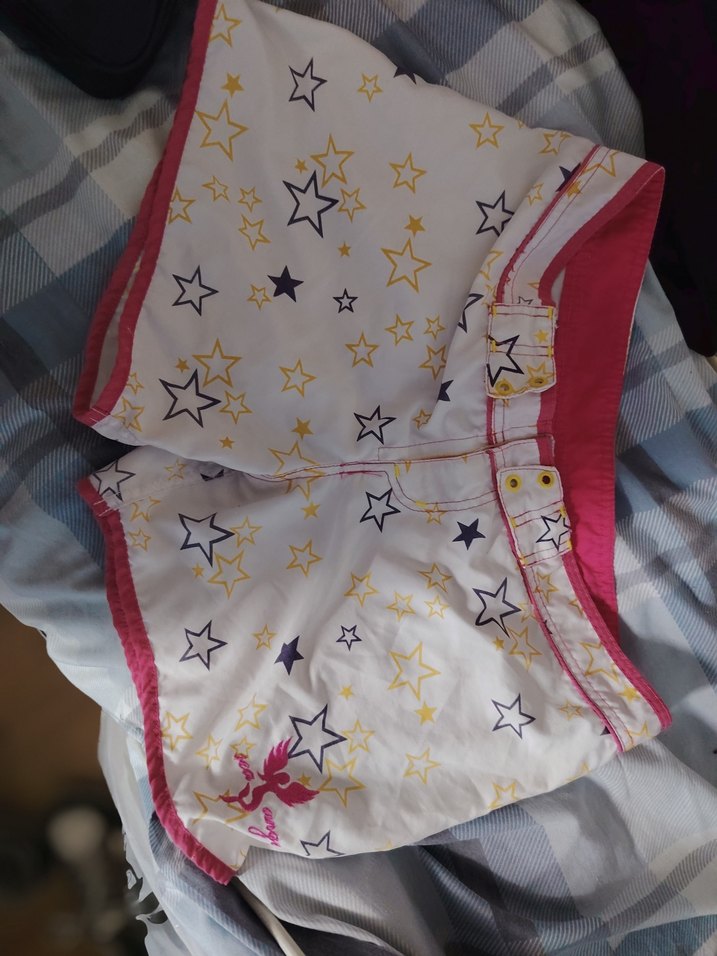 Parlak pembe ve beyaz kumaştan, yıldız desenli bol kesim şort. Tokalı beli ve bohem tarzı vardır.