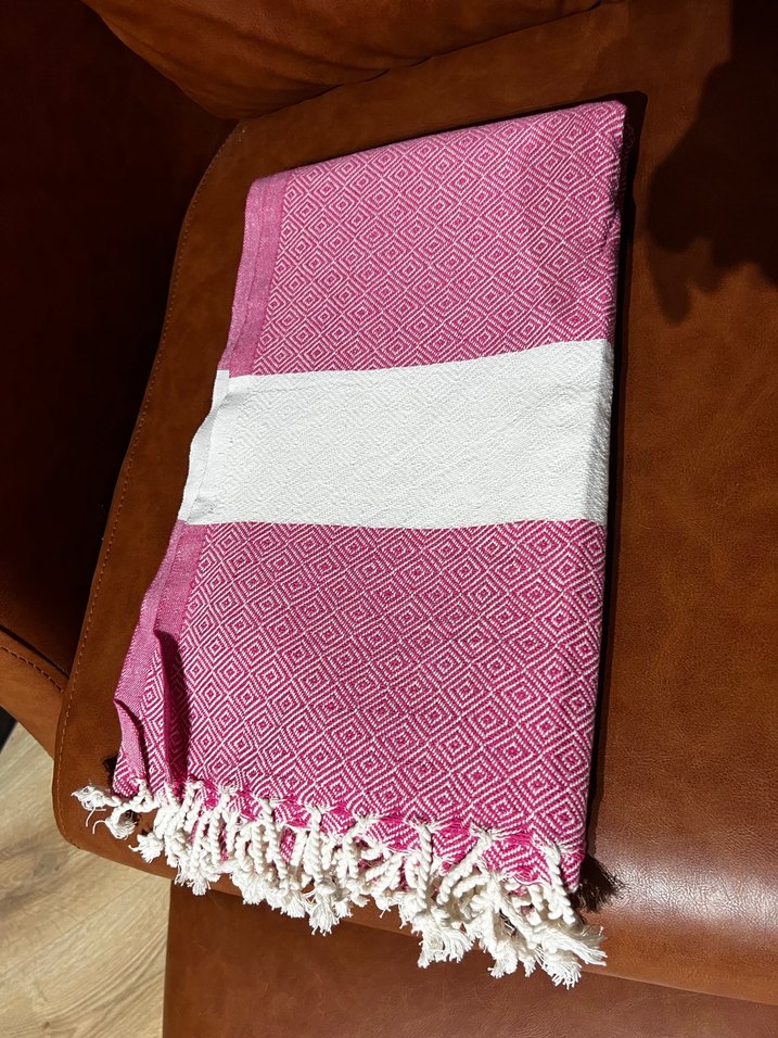 Pembe renkli, geleneksel tarzda ve püsküllü kenarları olan renkli desenli plaj havlusu, yumuşak ve emici dokuma kumaştan üretilmiştir. 95x175 cm #dokuma #peştemal #havlu #plajhavlusu