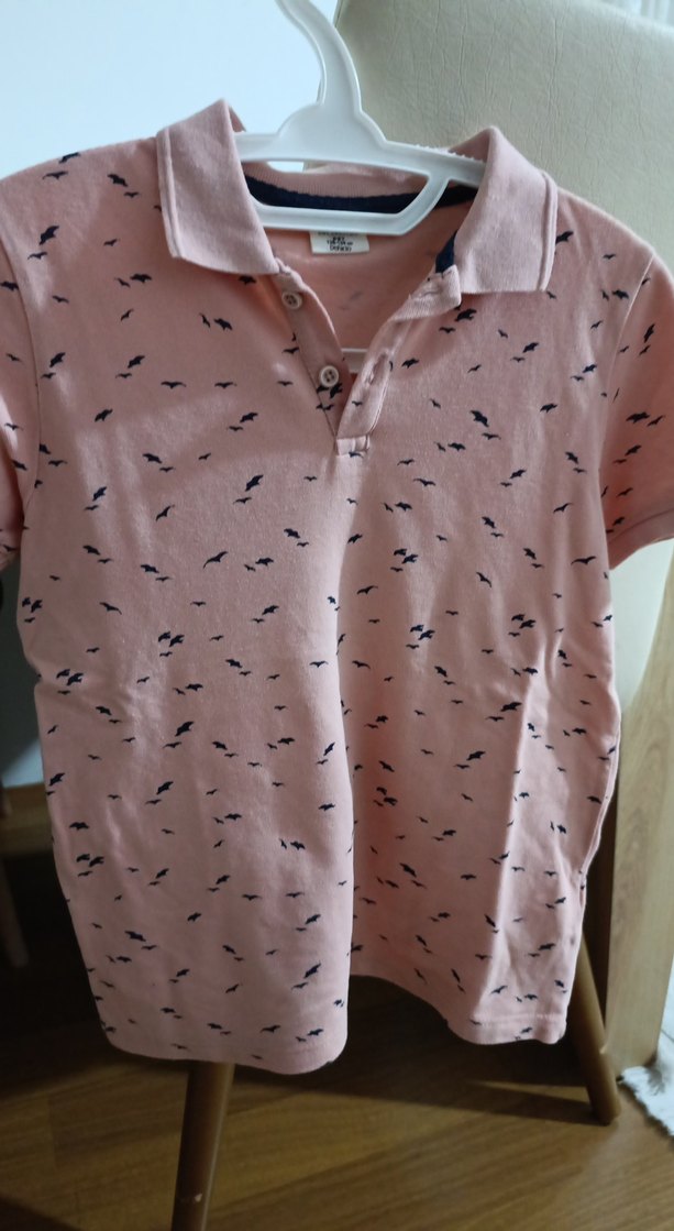 Pembe renkte, kısa kollu ve yakalı hamile tişörtü. Düğmeli ve baskılı desene sahip, rahat kesimle günlük kullanım için uygundur.