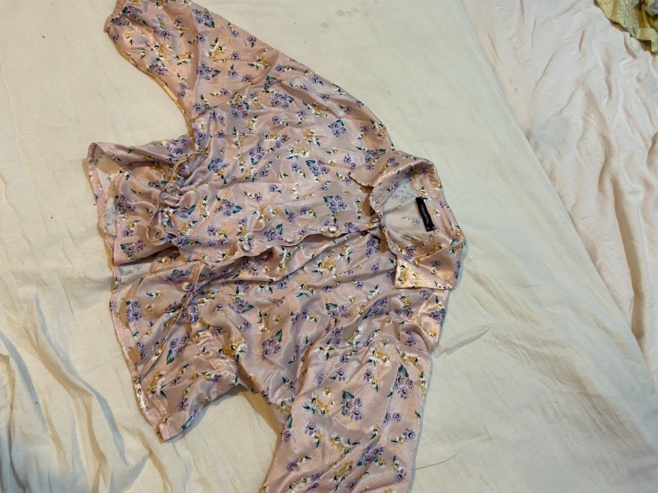 Pembe pastel tonlarda çiçek desenli, düğmeli, yakalı, kısa kollu, bol kesim saten gömlek. Günlük kullanıma uygun vintage sokak stili.