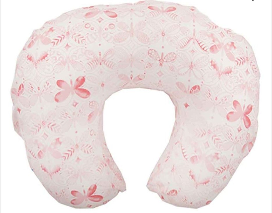 Pastel pembe renkte, kelebek desenli emzirme ve hamilelik minderi, konfor ve destek sağlar.