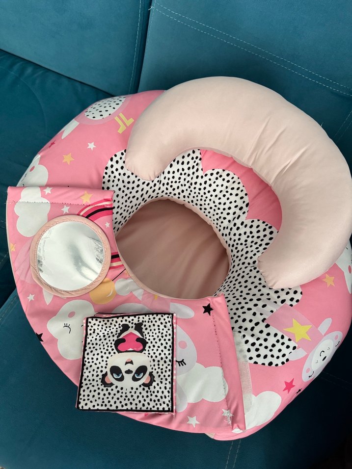Pembe pastel tonlarında, desenli emzirme ve hamilelik yastığı. Yumuşak dolgu ve küçük ayna ile pandalı aksesuar içerir.