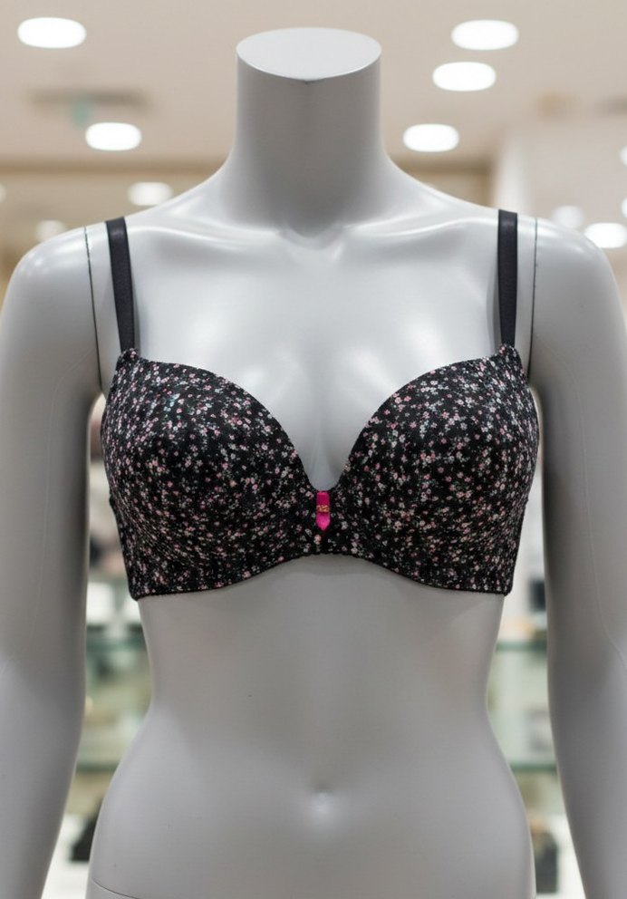 Koyu zemin üzerine pembe çiçek desenli, ayarlanabilir askılı glamour sütyen. Normal uzunlukta rahat kesim sunar.