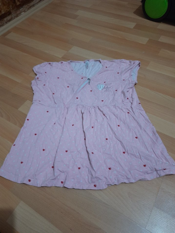 Pastel pembe renkli, V yakalı, kısa kollu, bol kesim hamile ve emzirme geceliği. Küçük kalp desenleri ve midi boy uzunluğa sahiptir.