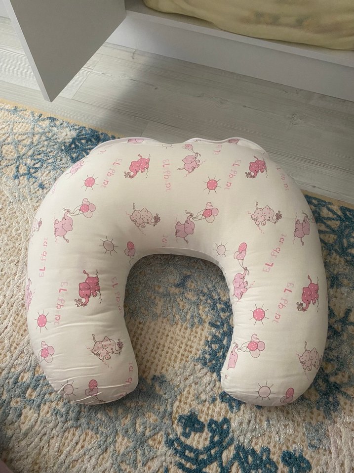 Pembe pastel tonlarında, sevimli desenlere sahip hamile ve emzirme yastığı, rahatlık ve destek sağlar.