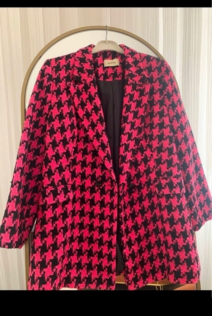 Pembe desenli, düğmeli, uzun kollu, normal boyda ve bol kesim kadın blazer ceket. Paris tarzında, günlük sokak giyimine uygun.hic kullanılmadı beden olmadığı için satılık L beden
