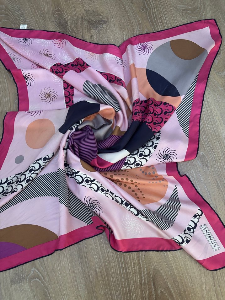 Pembe renkli, ipek dokulu fular, pastel tonlarda çağdaş ve avangart desenlerle drapeli yapıya sahiptir.