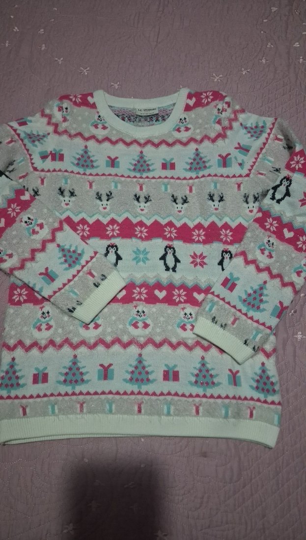 Pembe renkli, örgü kumaştan yapılmış, yuvarlak yaka ve uzun kollu, bol kesim kadın kazak. Penguen, geyik ve hediye desenleriyle rahat ve şık. ❄️