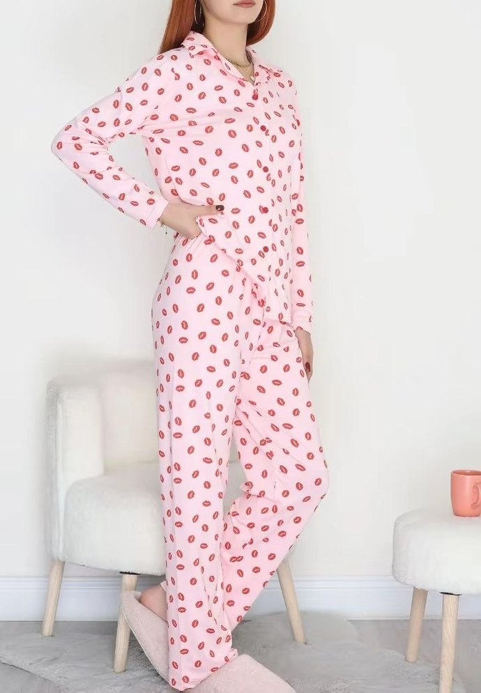 Pembe pastel tonlarda, uzun kollu, normal boyda ve bol kesim kadın pijama takımı. Desenli ve modern tarzıyla rahatlık sunar. ️