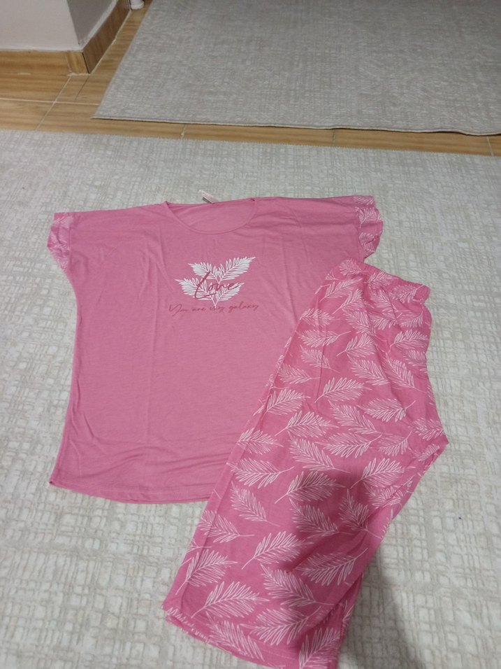 Kısa kollu, bol kesim pembe kadın pijama takımı. Pastel tonlarda, desenli ve rahat bir sokak stili sunar.