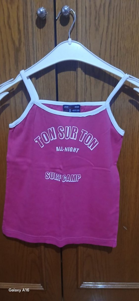 Pembe askılı, fitted kesim kız çocuk atletinde "ALL-NIGHT SURF CAMP" yazılı baskı bulunur. Rahat ve şık bir günlük stil sunar.