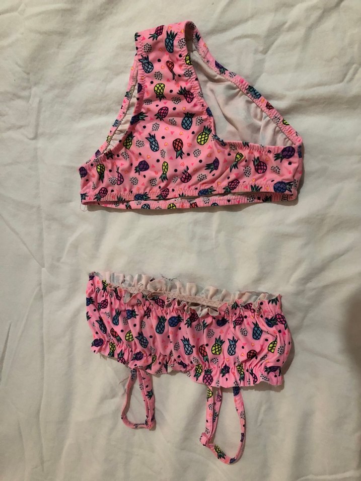 Pembe renkte, askılı ve renkli desenli kız çocuk bikini takımıdır. Pastel tonlarıyla plaj için uygundur. ️