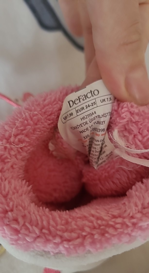 Pembe renkli, renkli desenli kız çocuk ev terliği. Velcro bantlı, yumuşak ve sıcak örme kumaştan, Türkiye üretimi, EUR 24-25 beden.
