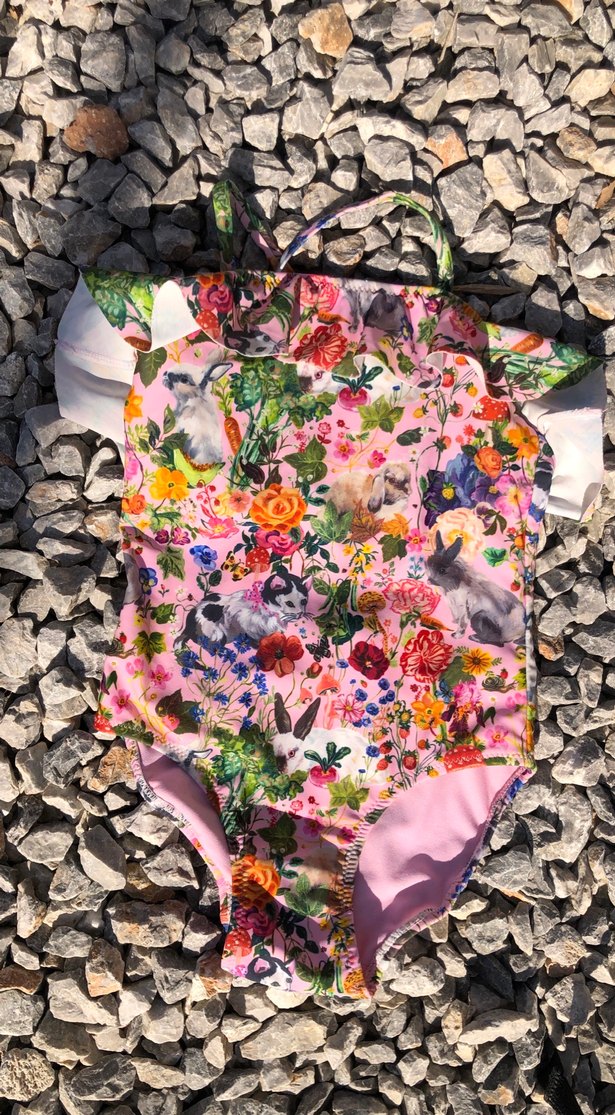 Pastel pembe renkli, desenli, fırfırlı ve kısa kollu kız çocuk mayosu. Yarım boğaz yaka tasarımı bulunur.