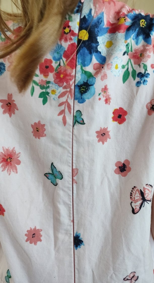 Pembe, pastel renklerde çiçek ve kelebek desenli, V yaka kısa kollu, midi boy,kız çocuk elbise