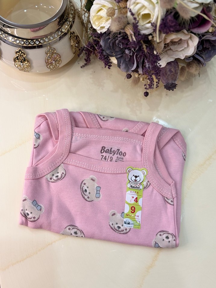 Kolsuz, pembe renkli, ayıcık desenli bebek body. Düğmeli ve bisiklet yaka, Babyloo markası, 74/9 beden. 1-3-6-9 aylik 4 adet seklinde gonderim yapilacaktir tek isteyen belirtirmi ona gore ilan acacagim 4 adet seklindet fiyatidir