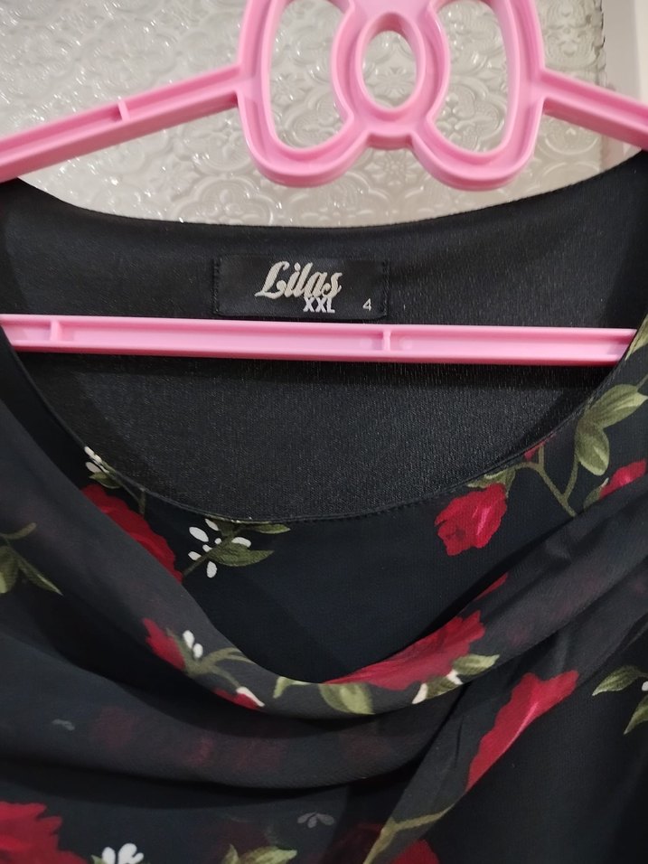 Pembe renkli, kolsuz, salaş kesim bluz. Çiçek desenli, fırfır detaylı ve normal boyda. Sentetik, yumuşak dokulu kumaştan üretilmiştir.