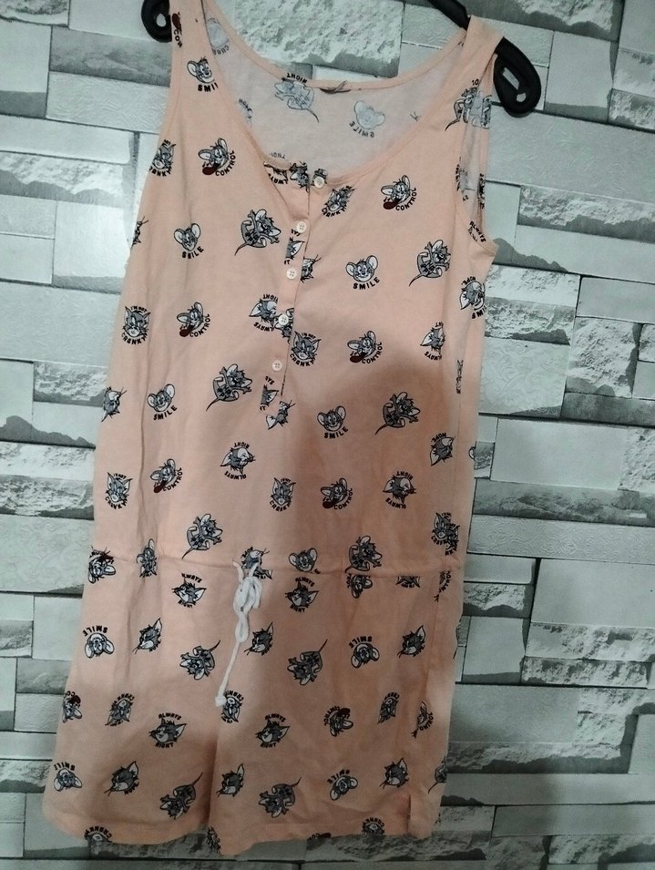 Pembe renkte, kolsuz ve V yakalı, düğmeli mini tulum. Desenli ve rahat sentetik kumaştan, günlük sokak stili için uygun.