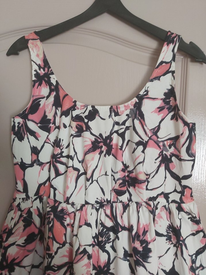 Pembe ve gri çiçek desenli, kayık yaka ve kolsuz midi elbise. Bol kesim ve fırfır detaylı, günlük kullanıma uygun.Arka kısmında kendi kumaşından fiyonk mevcut.