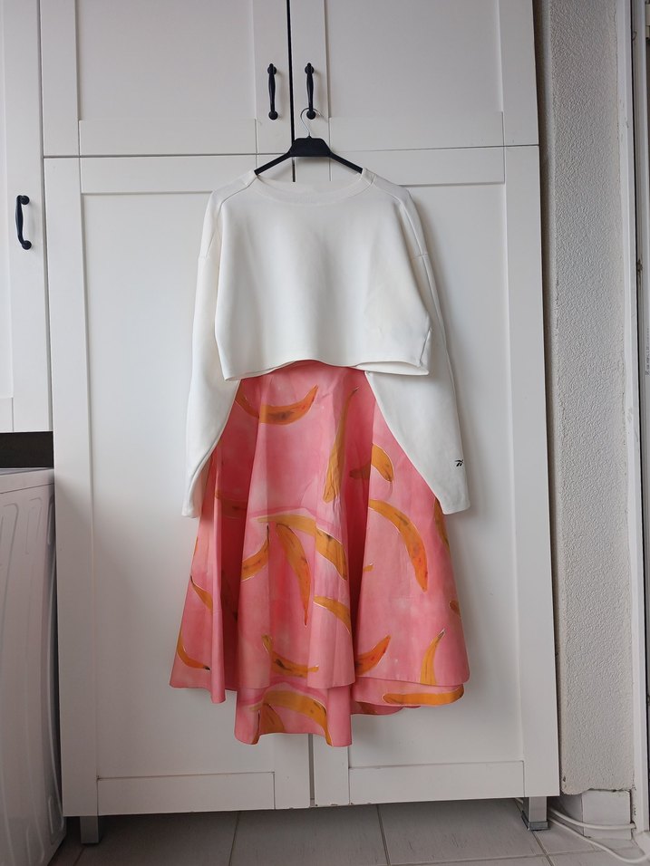 Pembe pastel tonlarında baskılı, satenimsi dokuda, bol kesim ve drapeli hamile eteği, günlük kullanım için uygundur.