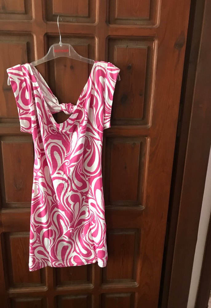 Pembe renkli, bağlamalı sırt detayı ve kayık yaka ile midi boy, kolsuz, vücuda oturan hamile tunik. Yumuşak ve parlak kumaştan, günlük kullanıma uygun.