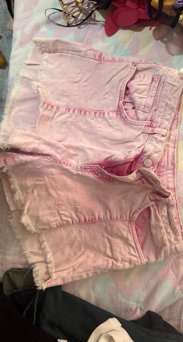 Bağlamalı desenli, bol kesim, pastel pembe midi şortu. Düğmeli ve yıpranmış kenar detaylı, bohem tarz için uygun.