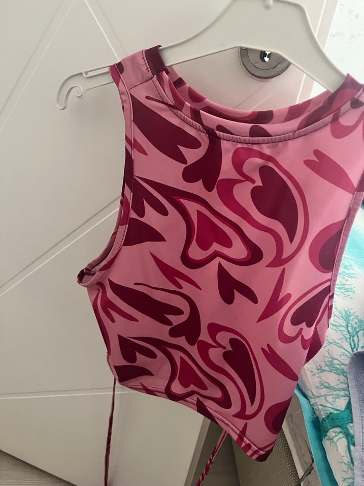 Dar kesim, askısız yakalı ve drapeli detaylı pembe pastel tonlarında tie-dye desenli mini atlet, sokak modası için uygundur.