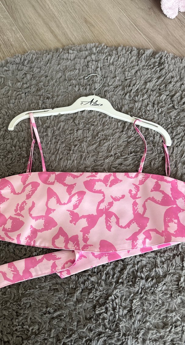 İnce askılı, dantelli ve desenli pembe mini bustiyer, yumuşak sentetik kumaştan, sokak modasına uygun.