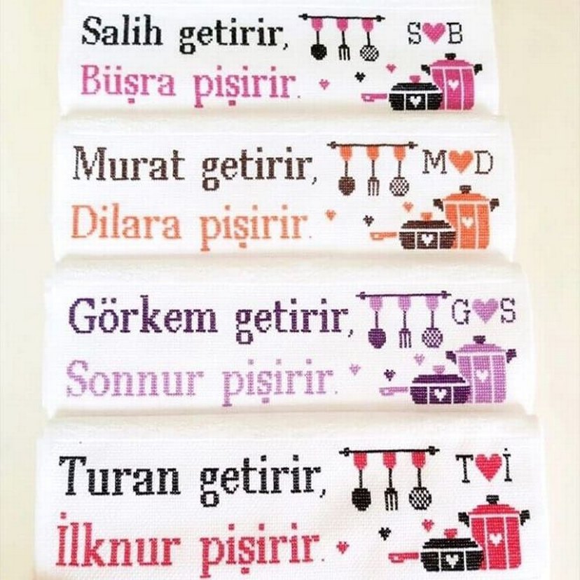 Üzerinde isimler ve mutfak gereçleri desenleri bulunan açık pembe mutfak havluları. Her havlu, yemek yapma ve getirme temalı isim çiftleri içerir.