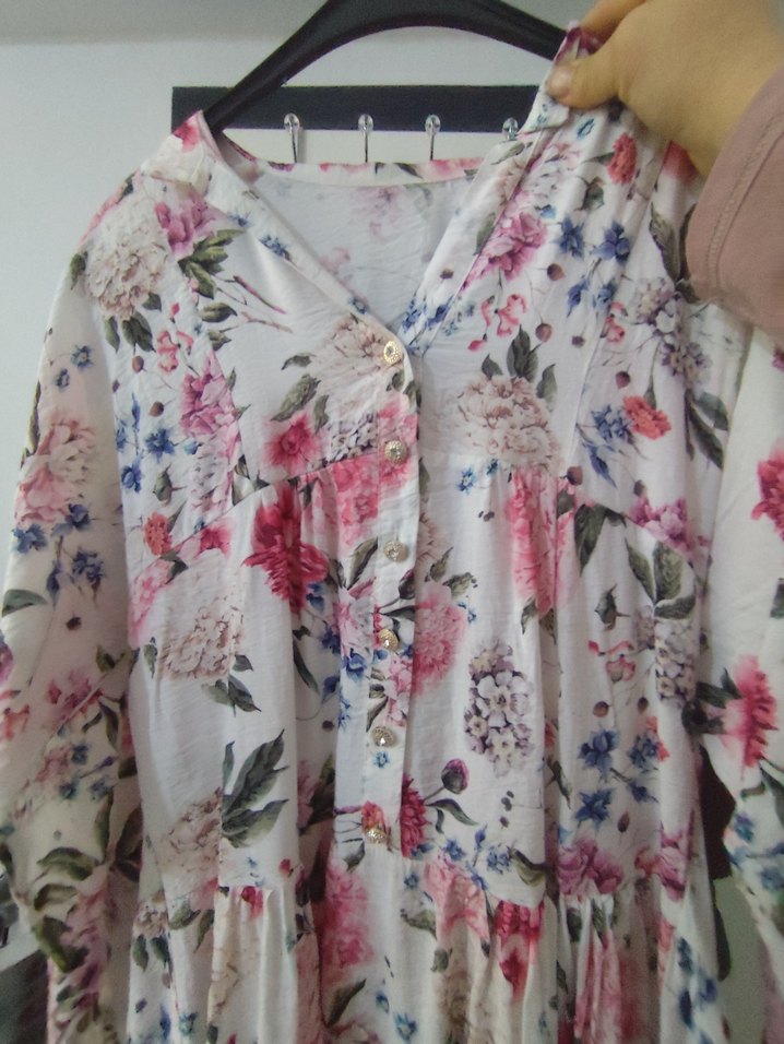 Pamuk kumaştan, uzun kollu ve düğmeli, V yakalı, bol kesim pembe pastel çiçek desenli uzun hamile bluzu. Günlük kullanım için bohem tarzda.