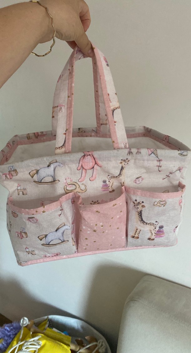 Pembe pastel tonlarında, hayvan ve oyuncak desenli bebek çantası. Önde çoklu cepleri ve taşıması kolay sapları vardır.