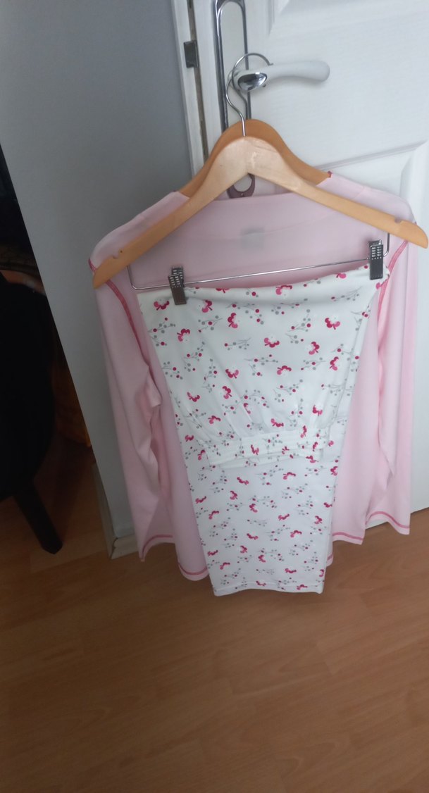 Uzun boylu, pembe pastel renkli, gecelik. Baskılı desene sahip ve vücuda oturan modeldir.