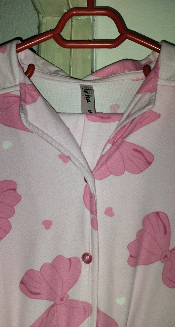 Pembe renkli, V yaka ve uzun kollı pijaması. Gevşek kesim, midi boy ve pastel tonlarda baskılı desene sahip.