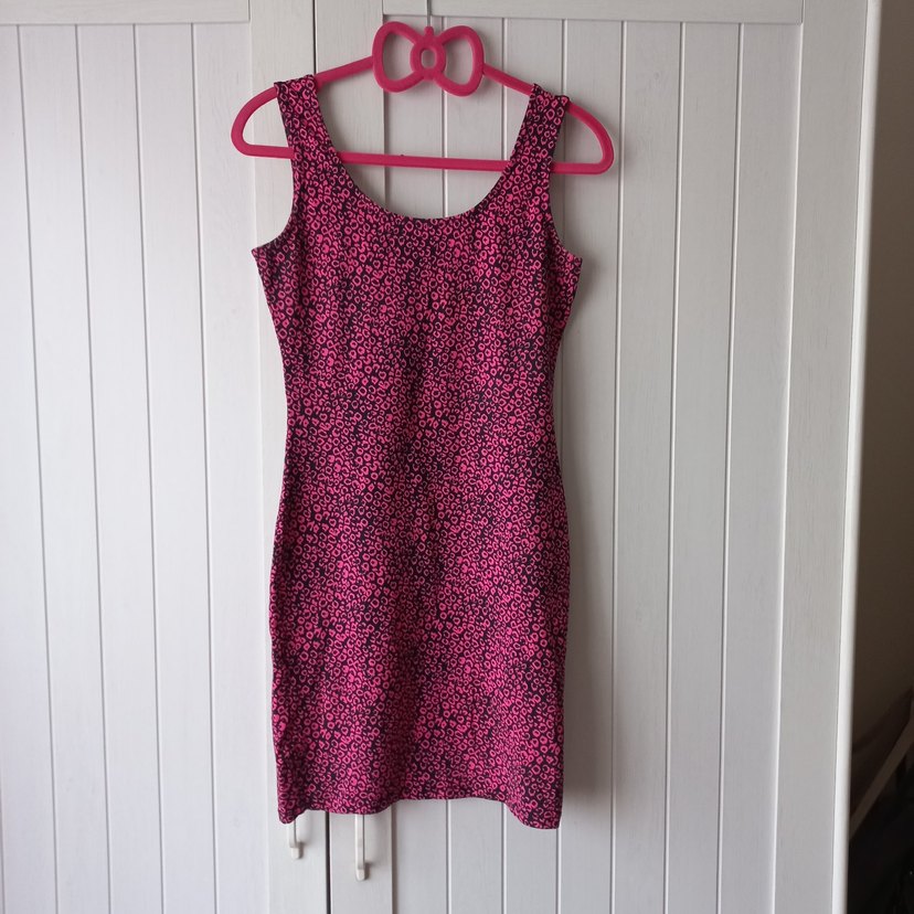 Pembe, sıfır kol, pamuk ve alastan dan üretilmiş, mini boy elbise. Renkli leopar desenli, sade ve şık sokak tarzı elbise.
