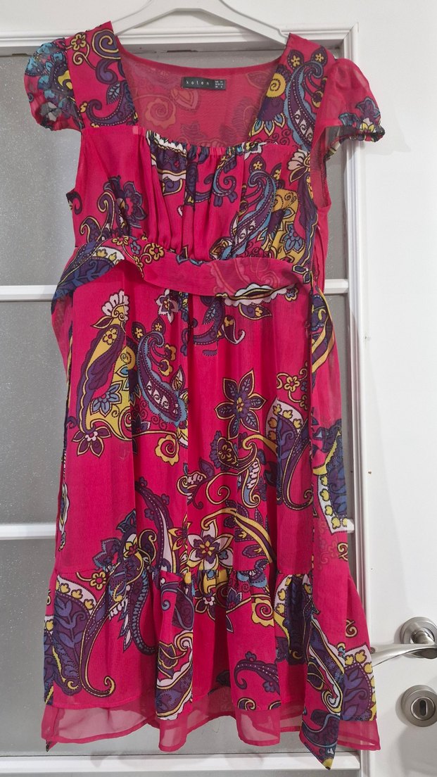 Renkli bohem desenli, dökümlü, pembe şifon elbise. İpek gibi kumaştan, kisa kollu ve straplez yakalı, rahat kesim. Fermuari yapilmali o sebeple fiyati uygun.