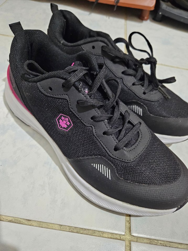 Pembe desenli, siyah bağcıklı kadın spor ayakkabısıdır. Kauçuk malzemeden yapılmış, ince topuklu ve sportif şıklık sunar.