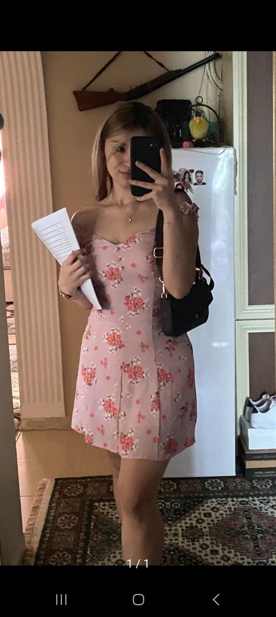 Pastel pembe tonlarında, straplez ve ince askılı, çiçek desenli, vücuda oturan midi elbisedir.