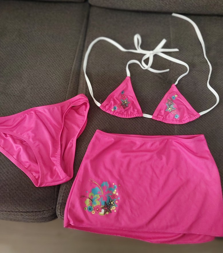 Canlı pembe renkli üç parçalı kız çocuk bikini takımı; ince askılı baskılı üst, uyumlu alt ve çiçek desenli etekten oluşur, plaj için uygundur.